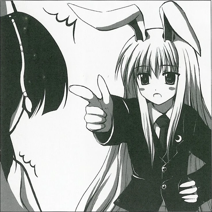 | 兎角同盟は、月の兎という鈴仙・優曇華院・イナバをリーダーに、地上の妖怪兎達との間に結んだ兎の理想郷を考える集団である。 | La Liga cuerno de conejo, liderada por la coneja lunar Reisen Udongein Inaba, es un grupo creyente en una utopia para conejos que vincula a todos los conejos youkai de la tierra. | |