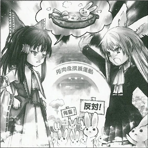 | それに対し神社側は、「兎の肉の何処が野蛮なのよ。 | Como respuesta, la miko Reimu Hakurei dijo: "¿Qué es tan salvaje en la carne de conejo? | |
