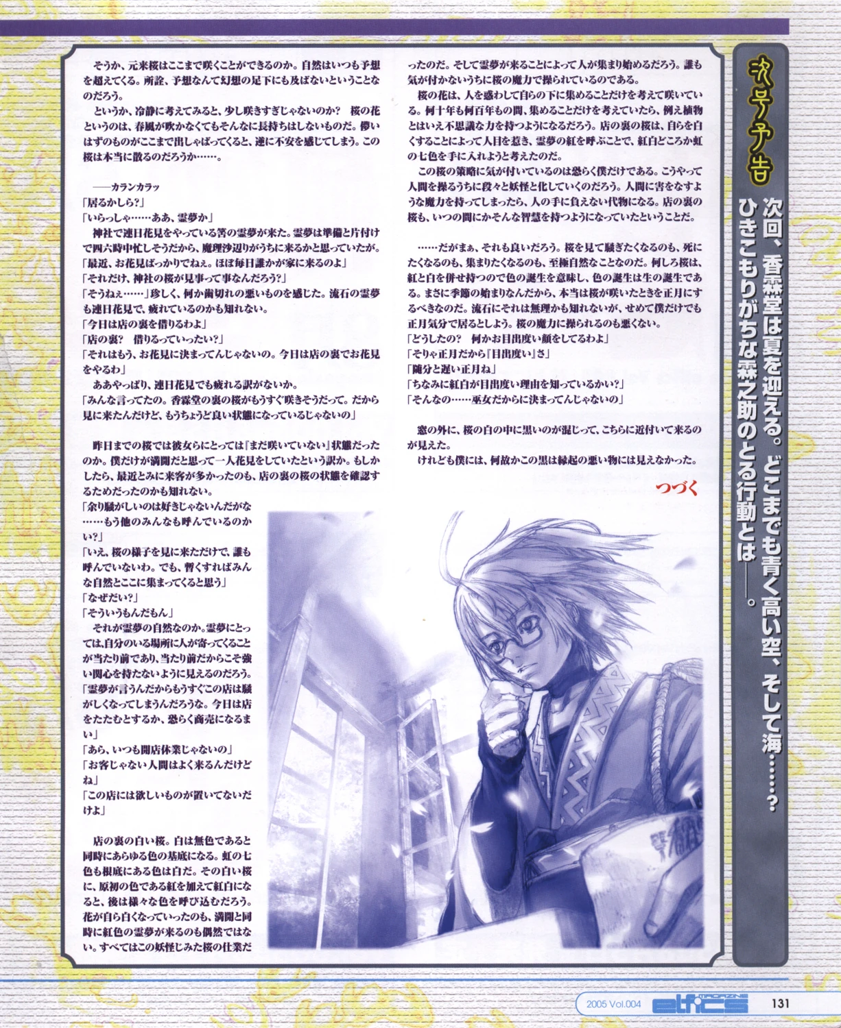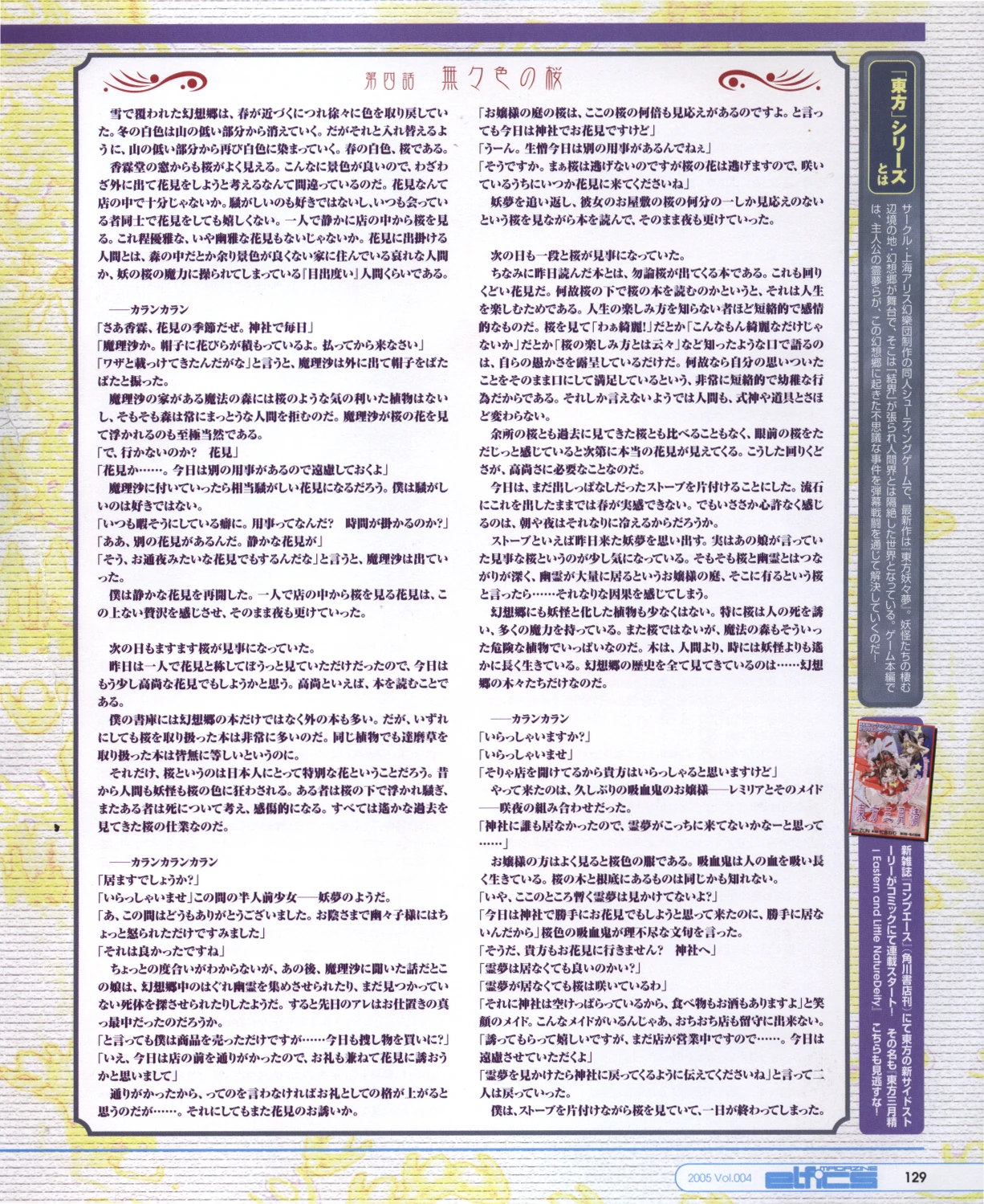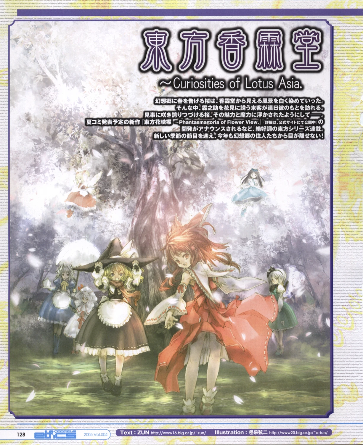 | 幻想郷に春を告げる桜は、香霖堂から見える風景を白く染めていった。そんな中、霖之助を花見に誘う来客が連日彼のもとを訪れる。見事に咲き誇り続ける桜、その魅力と魔力に浮かされたようにして――。夏コミ発表予定の新作「東方花映塚 ~ Phantasmagoria of Flower View.」(詳細は、公式サイトにて公開中)の開発がアナウンスされるなど、絶好調の東方シリーズ連載。新しい季節の節目を迎え、今年も幻想郷の住人たちから目が離せない! | El escenario visto desde Kourindou estaba pintado de blanco por las sakuras que anunciaban la llegada de la primavera a Gensokyo. Y durante ese tiempo, visitantes invitando a Rinnosuke a un avistamiento floral llegaban cada dia. Perdido en el deleite entre el encanto y el glamor de los esplendidos arboles de cerezo... Tambien sirve para anunciar el esperado estreno, en el Comiket de verano, del nuevo juego "Phantasmagoria of Flower View," lo mejor de la novelizacion de las series Touhou. El punto de partida que saluda a una nueva temporada, nuevamente este año; ¡Los residentes de Gensokyo no podran quitarle los ojos de encima! |