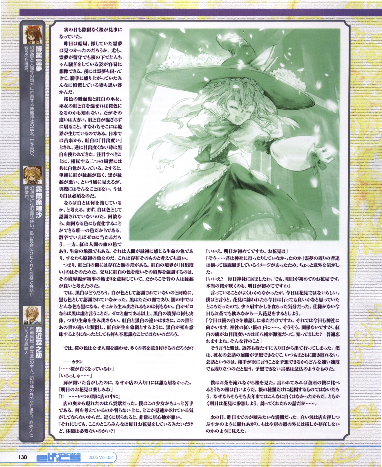 | 「さあ香霖、花見の季節だぜ。神社で毎日」 | "Hey Kourin, ¡Es temporada de ver las flores! Todos estan en el santuario." |