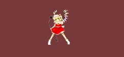Hermana del Demonio Flandre Scarlet Habilidad: Destruccion de cualquier cosa El jefe del Extra. Tambien la hermana menor de la Lady. Ella es una chica magica vampirica y ha sido la hermana menor de los Scarlet Devil por cerca de 495 años. Ella esta un poco loca y normalmente no se le permite salir de su prision, pero ella usualmente no trata de escapar por su cuenta. Ella respeta mucho a su hermana mayor Remilia, pero su poder destructivo incontrolable excede al de su hermana. Aunque ella es normalmente docil, su locura hace dificil que los demas la comprendan. Cuando los vampiros atacan a los humanos, ellos generalmente tratan de mantenerlos vivos para asi succcionarles la sangre, pero como Flandre siempre a sido alimentada con platos ya preparados, ella no sabe como atacar correctamente a un humano. Cuando trata de atacar a un humano, se emociona demasiado y los explota sin dejar una gota de sangre. Tal vez ella no sea capaz de decir que su comida diaria esta hecha de seres humanos. Sus comidas parecen ser cosas muy normales como pasteles y te, despues de todo... | |