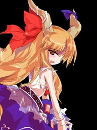 Sueño acumulado, ilusion, y pandemonium Especie: Oni Supuestamente no hay onis en Gensokyo, pero esta chica insiste en que ella es una oni. Los oni son en general alegres y aman beber, festejar y competir con humanos en cualquier clase de competencia, desde simple peleas hasta juegos de bebidas. Cuando encuentran a un humano que les gusta, ellos tientan a los humanos a cualquier desafio que ellos deseen. Si los humanos pierden, son secuestrados . Los oni encuentran estos juegos muy divertidos, pero los humanos no aprecian la naturaleza de tal diversion. Simplemente, los humanos no podian compararse con el nivel de habilidad de los oni. Los humanos podrian haber disfrutado tambien como los oni si ellos trataran de llegar al nivel de poder de sus oponentes, pero no podian. Peor aun, los humanos intentaron destruir a los oni con trucos ocultos y engaños. El secuestro por onis resulto ser un simbolo del miedo humano, que era la razon de ser del oni. En un sentido, ese miedo era necesario para la raza humana... Aun asi, los humanos egoistamente pusieron fin a todo esto. Los oni, se fueron cansando de ser constantemente engañados y asesinados, abandonaron a los humanos para siempre y se mudaron a un lugar fuera del alcance de los humanos, o eso es lo que las leyendas dicen. De cualquier modo, no se ha vuelto a ver a los oni desde esa vez. Esta chica insiste en que ella es una oni. Ella ciertamente es alegre y le encanta tanto beber,y tener fiestas que ella las tiene cada 3 dias. La razon para eso se da en el juego, por eso no lo mencionare aqui. Pero a decir verdad, ella quiere restaurar la relacion entre humanos y oni. ¿Ahora, porque todo eso fallo...? Eso tambien se menciona en el juego, al final. ··