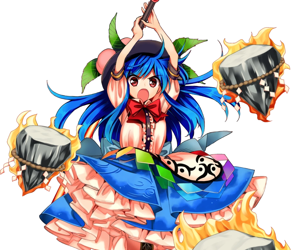 Celestial del Pensamiento Escarlata, Aislada de este Mundo Transitorio Tenshi Hinanawi "Me alegro de que tenga que conocer a una gran compañera que me sienta tan bien! " Una Celestial delincuente que desafía el sentido común. Al descender a Gensokyo por primera vez en mucho tiempo, ¡descubrió una moda sin precedentes de la Posesión Perfecta! Después de haber encontrado una pareja adecuada para su estado noble, nadie en la superficie de la Tierra puede tener una oportunidad contra ella. Una luchadora de uso múltiple armada con su espada del pensamiento escarlata, que cambia su forma para que coincida con la situación, y ataques de todo rango usando Piedras Angulares que ella puede controlar a voluntad. Y para colmo, su leyenda urbana que controla la atmósfera "H.A.A.R.P." provoca tormentas masivas! | |