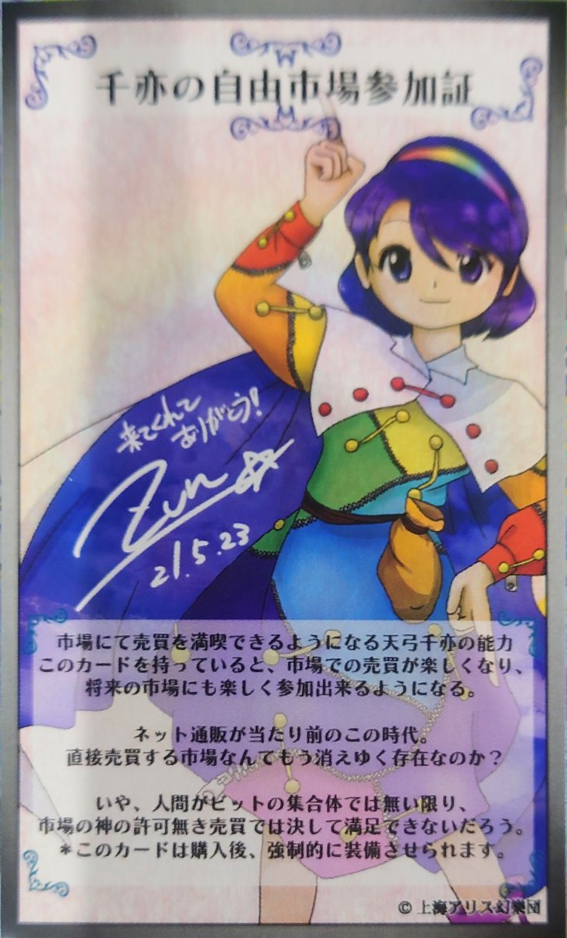 千亦の自由市場参加証 市場にて売買を満喫できるようになる天弓千亦の能力 このカードを持っていると、市場での売買が楽しくなり、将来の市場にも楽しく参加出来るようになる。 ネット通販が当たり前のこの時代、 直接売買する市場なんて、もう消えゆく存在なのか? いや、人間がビットの集合体では無い限り、 市場の神の許可無き売買では決して満足できないだろう。 *このカードは購入後、強制的に装備させられます。 | |