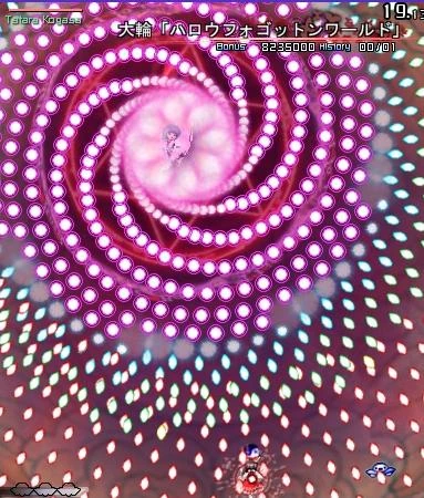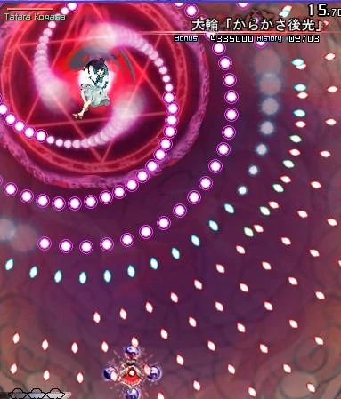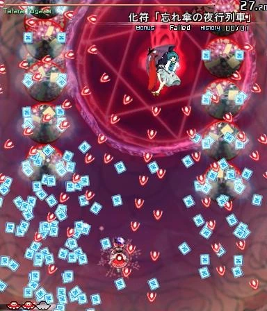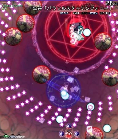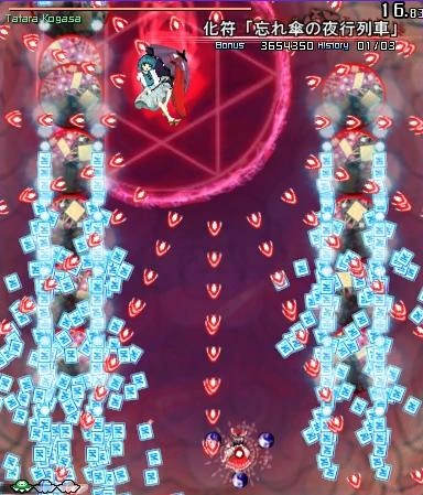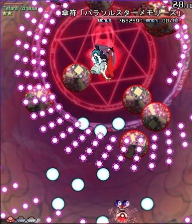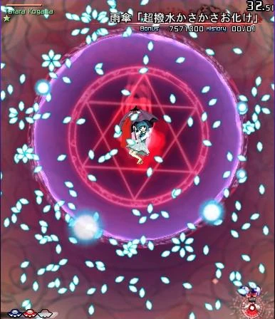 | Comentario: | El nombre de esta spellcard es un juego de palabras. "Sequedad" ("kasakasa") es una repetición de la palabra "paraguas" ("kasa"). |