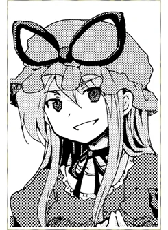 ○境目に潜む妖怪 八雲 紫(やくも ゆかり) Yukari Yakumo 種族:妖怪 能力:境界を操る程度の能力 幻想郷の境の何処かにすむ妖怪。 境自体は普通の人には見えない為、何処に住んでいるのか不明。 最低でも同じ境上にある神社ではない。 幻想郷に住む妖怪の中では、かなり昔から存在し力も強大である。今 では幻想郷そのもののことを良く知っている者は、妖怪の中でも数少 ない。彼女は胡散臭く見られるが、それは人間っぽさが少なく、行動 が理解出来ない所為でもある。その能力は、困ったら簡単に幻想郷を 潰す事もできる危険な妖怪でもある。 | |