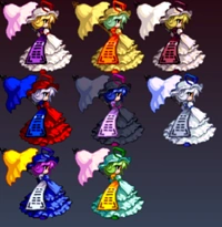 Todos los trejes alternos de Yukari Yakumo en SWR, Nótese que uno de sus trajes no varía en el traje normal de Yukari, otro traje alternativo hace referencia a Shinki y otro traje hace referencia a Yuyuko Saigyouji