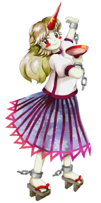 Jefe del Stage 3 El Murmurante Fenomeno Sobrenatural Especie: Oni Una de las Oni que, junto con Suika, fueron llamadas las Cuatro Devas de las Montañas. Varios youkai viven alíi, aunque los oni son el grupo más representativo de todos ellos. Los oni eran proactivos y aceptaban incluso a aquellos youkai que eran odiados en el mundo de la superficie. Esa condición era que sellaran a los espíritus malignos del infierno. A cambio, los youkai de la superficie prometian no entrar a la ciudad subterránea. Los oni han cortado toda comunicación con el mundo superior, y han establecido una nueva sociedad completamente desconocida para los humanos. Como uno podría esperar de un oni, Yuugi disfruta beber todos los días y levantar rocas. | |