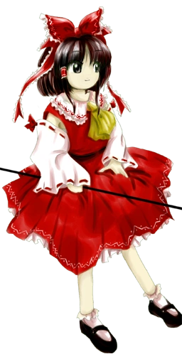• (紅魔郷、妖々夢) 暗めの赤い瞳、黒い髪、大きな赤いリボンで髪を束ねている、しばしば御幣を携えている。赤と白の巫女装束とあまり似てないドレスを着て、それから分離した肩を覆っていない袖、赤いネッカチーフを付けている。