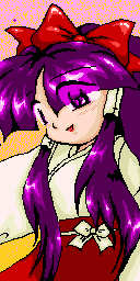 • (Touhou 1 to 5) Фиолетовые глаза, длинные фиолетовые волосы, носит большой красный бант в волосах. Носит красно-белое платье, отдаленно схожее с одеждой японских жриц при храмах.