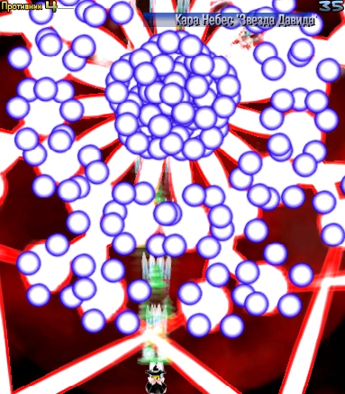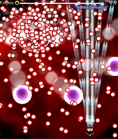 Ремилия формирует сложный узор из красных лазеров, из каждого угла которого летят крупные синие снаряды. Крайние просто стреляют в случайных направлениях, а те, что ближе к вампиру, выпускают пять узоров, формирующих звёзды.