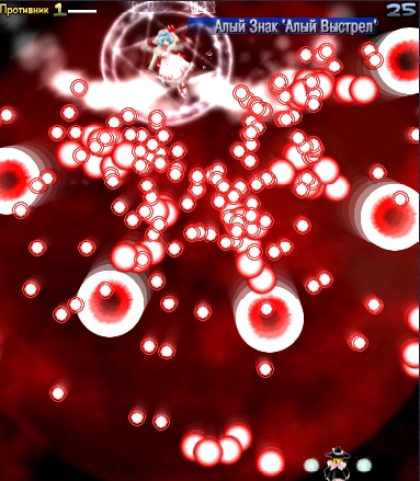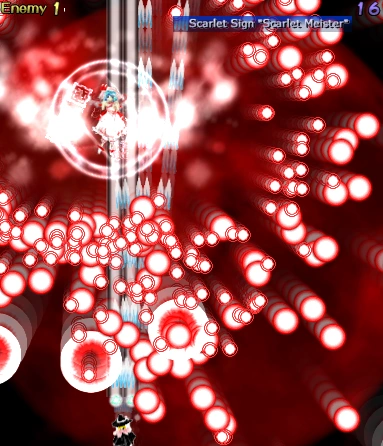 Ремилия выпускает кольца снарядов, опадающих вниз множеством снарядов. Всё даммаку в этой спелл-карте оставляет за собой красный шлем.