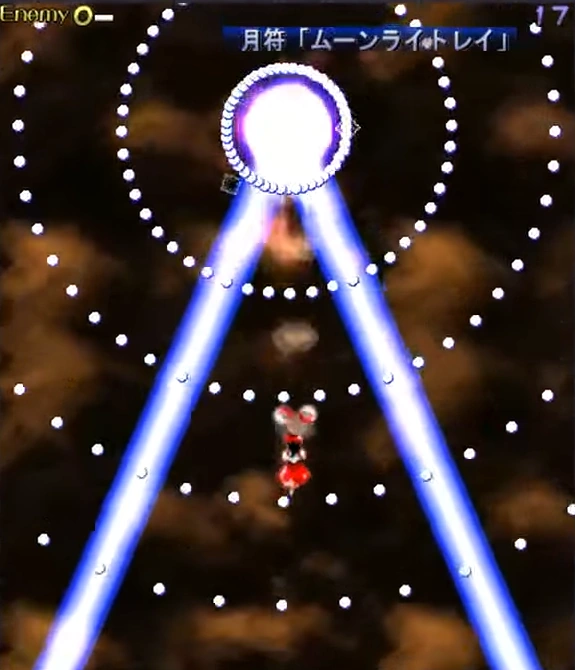 Два лазера держат противника перед Румией, в то время как она стреляет разлетающимися пулями.