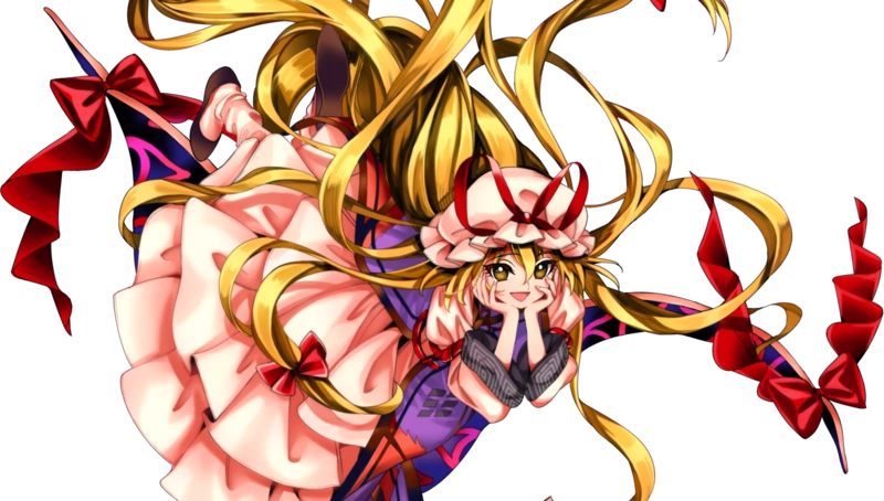 Юкари сидит на верхушке крыши Храма Хакурей и сидит, махая веером и смотря за битвами.