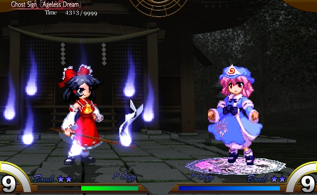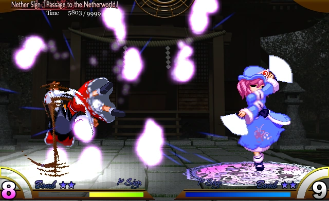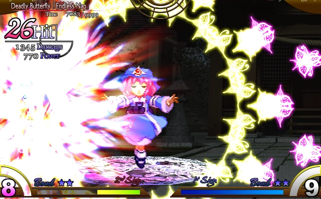 Ююко взлетает в воздух, с веером позади неё и выпуская в направлении противника вишнёвые лепестки и кольца из данмаку .
