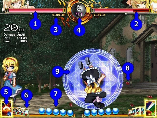 Каждый персонаж имеет 10,000 жизней во все стандартных «VS» режимах. В режиме Story, оппоненты-боты имеют меньше (Иногда — больше?) HP чтобы компенсировать бесконечность спеллкарт, и отсутствия восполнения колоды игрока после каждого выиграного боя.