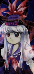 In my humble opinion, I think that Keine is the most interesting character in Imperishable Night. Her Spell Cards are intriguing and challenging, and her look itself is pretty unique. Also, her bent... I mean her unusual hat goes perfect with the title “The Half-beast of Knowledge and History.” And speaking of Keine we can not talk about her hairdo… White with blue highlights. It’s probably saying that she is a cold intellectual.