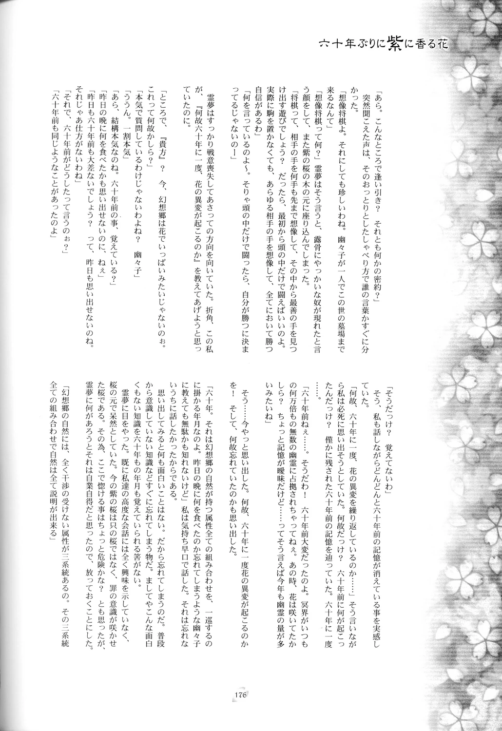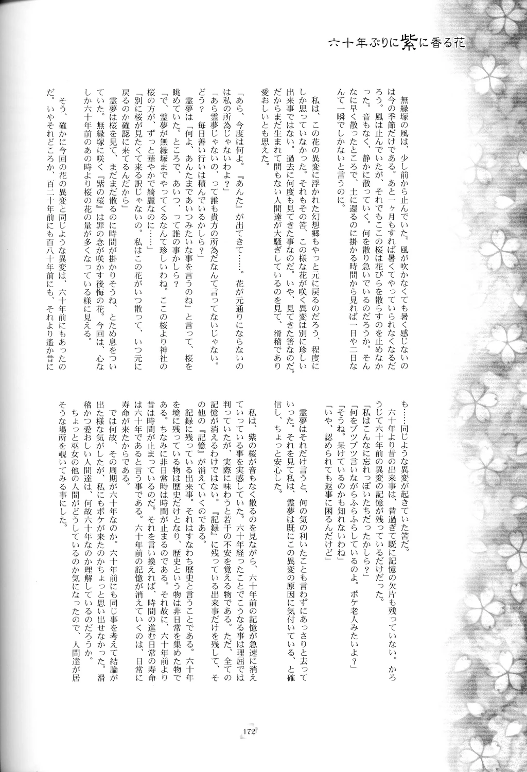 | 「今起こっている花の異変は、六十年に一度、繰り返して起こる異変なのです」 | "This flower incident right now is something that repeats itself once every sixty years." |