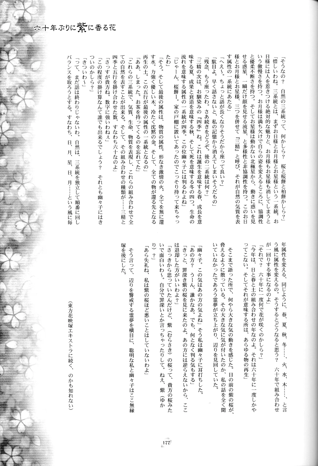 | 「六十年。それは幻想郷の自然が持つ属性全ての組み合わせを、一巡するのに掛かる年月なのよ。昨日の晩に何を食べたのか忘れてしまうような幽々子に教えても無駄かも知れないけど」私は気持ち早口で話した。それは忘れないうちに話したかったからである。 | "Sixty years. That's the time it takes for the natural cycles of Gensokyo to run their course one full time. I don't know if there's any point to explaining it to someone who can't even remember what she had for breakfast yesterday, though." I was speaking quickly and excitedly. I wanted to say it before I forgot again. |