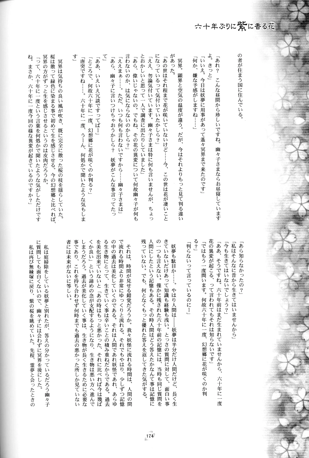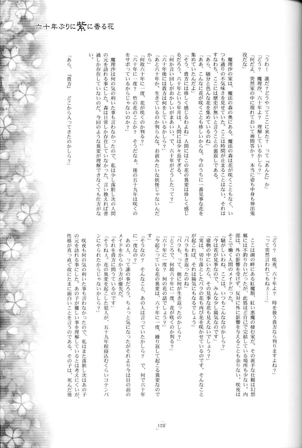 | 「それで、何故六十年に一度、花の異変が起こるのかしら?」 | "So then, why does the flower incident happen once every sixty years?" |