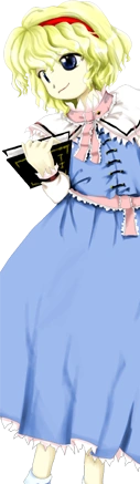 A magician living in the Forest of Magic. She possess the ability to use magic. Puppetry is a type of magic too. She rarely goes out by herself, but she had no other choice this time. She has many similarities to Marisa, namely living in the Forest of Magic, being a magician and having an obsession with collecting things. However, they have an absolute difference in that Alice is a magician as a species while Marisa is a human magician. Other than that, they're also different in using forest's mushroom as preference or not. Of course, Alice is the one not using them. However, it is not because of such matter that makes both on bad terms. Magic is her weapon. A magician's magic is always originally developed by the magician.