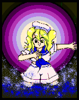 Wears a mostly white sailor uniform which looks too small for her and has a blue neckerchief and a white hat. She has blond hair and light brown eyes. | |