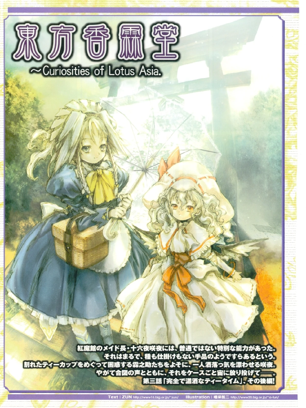 | 紅魔館のメイド長・十六夜咲夜には、普通でない特別な能力があった。それはまるで、種も仕掛けもない手品のようですらあるという。割れたティーカップをめぐって困惑する霖之助たちをよそに、一人洒落っ気を漂わせる咲夜。やがて合図の声とともに、それをケースごと宙に放り投げて――。 | The Head Maid of the Scarlet Devil Mansion, Sakuya Izayoi, had a particularly unusual ability. It was like sleight of hand without any kind of set-up. Unlike the bewildered Rinnosuke and others, Sakuya alone was exhibiting a bright mood. Finally, with a single warning, she threw the case into the air... |