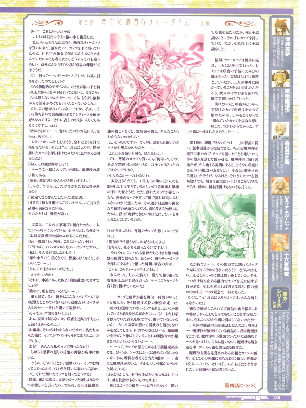 | 結局、ティーカップは無事に売れ、二人は店を出て行った。レミリアは咲夜の手品に大喜びの様子だった。霊夢はしばらく唖然としていたが、二人が神社に向かっていることを思い出したんだろう、飲みかけのお茶を置いて慌てて追いかけていった。 | In the end, the teacups were sold without a problem, and the two of them left the shop. Remilia seemed greatly pleased with Sakuya's performance. Reimu was in mute amazement for a while, but then she must have remembered that those two were going to the shrine, so she left behind the half-drunken tea and went chasing after them. |