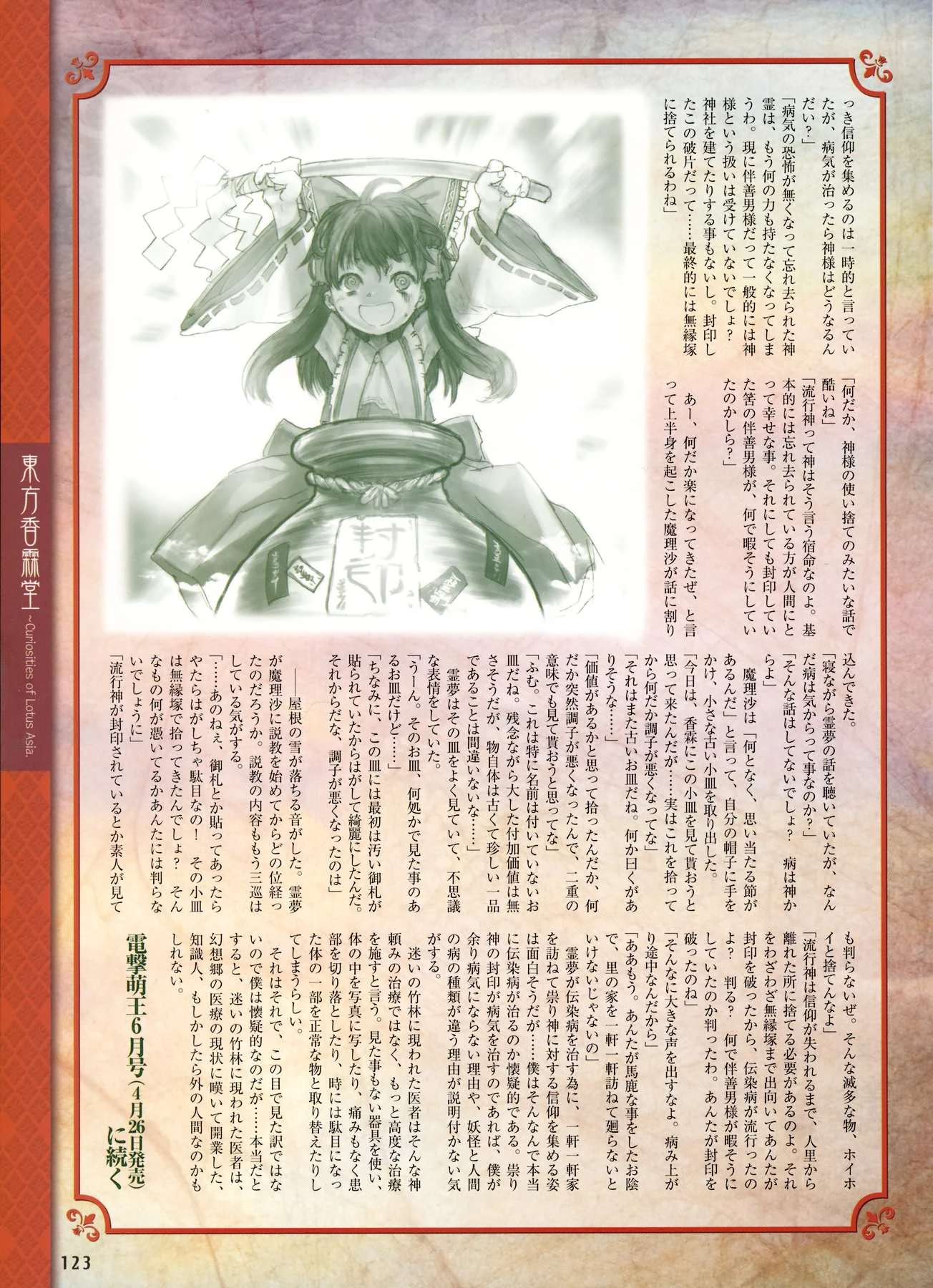 | 霊夢が伝染病を治す為に、一軒一軒家を訪ねて祟り神に対する信仰を集める姿は面白そうだが……僕はそんなんで本当に伝染病が治るのか懐疑的である。祟り神の封印が病気を治すのであれば、僕が余り病気にならない理由や、妖怪と人間の病の種類が違う理由が説明付かない気がする。 | |