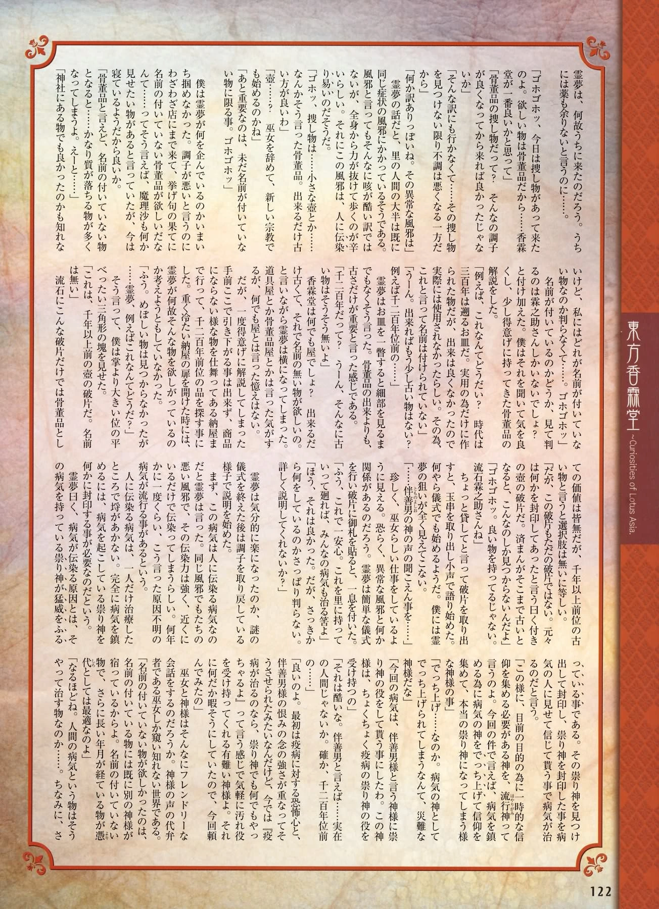 | 名前が付いているのかどうか、見て判るのは霖之助さんしかいないでしょ? と付け加えた。僕はそれを聞いて気を良くし、少し得意げに持ってきた骨董品の解説をした。 | |