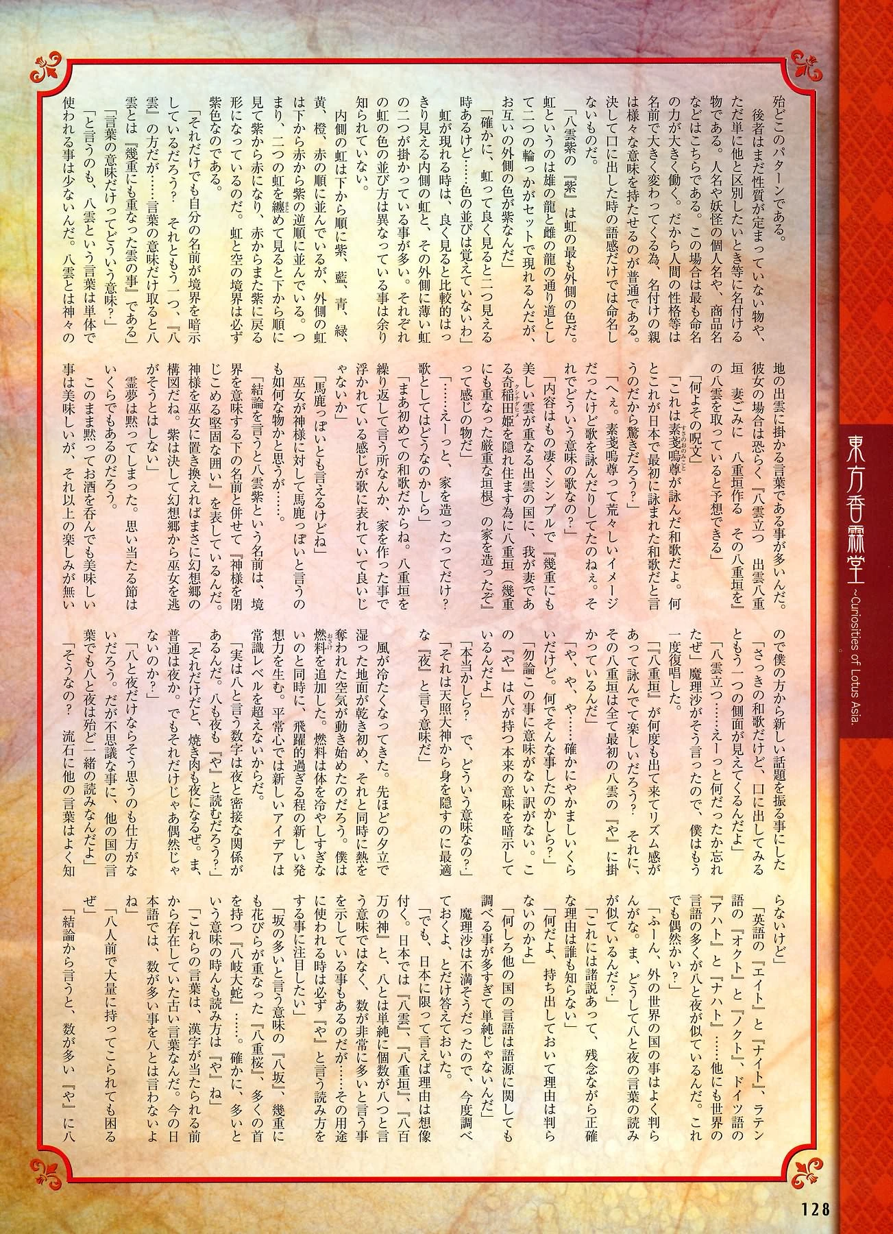 "The 'Yukari' in Yukari Yakumo's name means violet, and violet is the outer-most color in the rainbow. In fact, when a dragon flies through the sky, the pair of rainbows it leaves behind appear to be an identical set, but in fact, the outermost color of both is violet."
