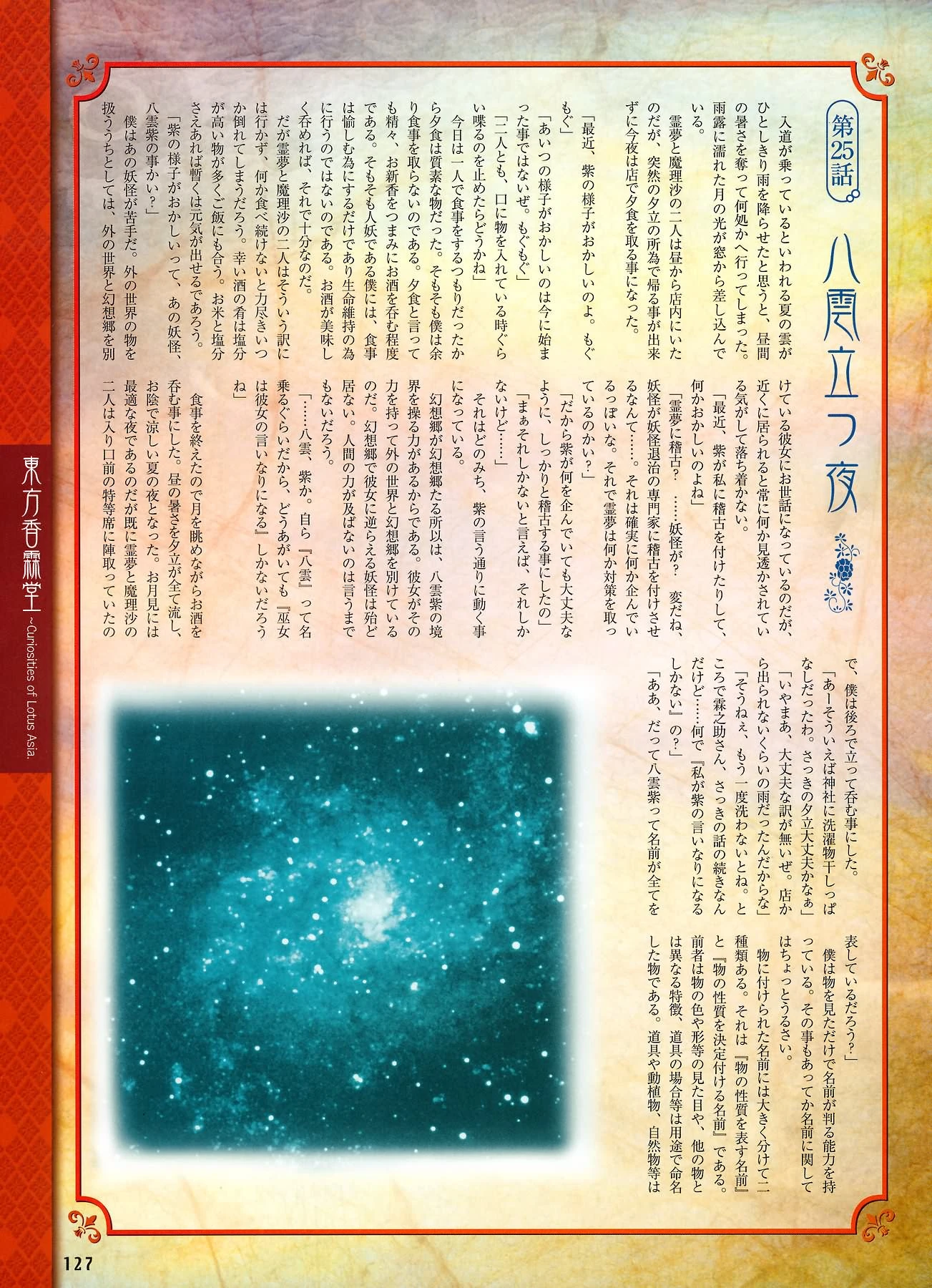 The clouds that had given us a sudden squall earlier in the evening had completely vanished. In their place, the skies of Gensokyo were filled with a countless number of stars. Forgetting my sake, I gazed up at the starry sky. The silvery river that flowed through the sky was more than enough to crush any reckless challengers who thought they could count every star within it.
