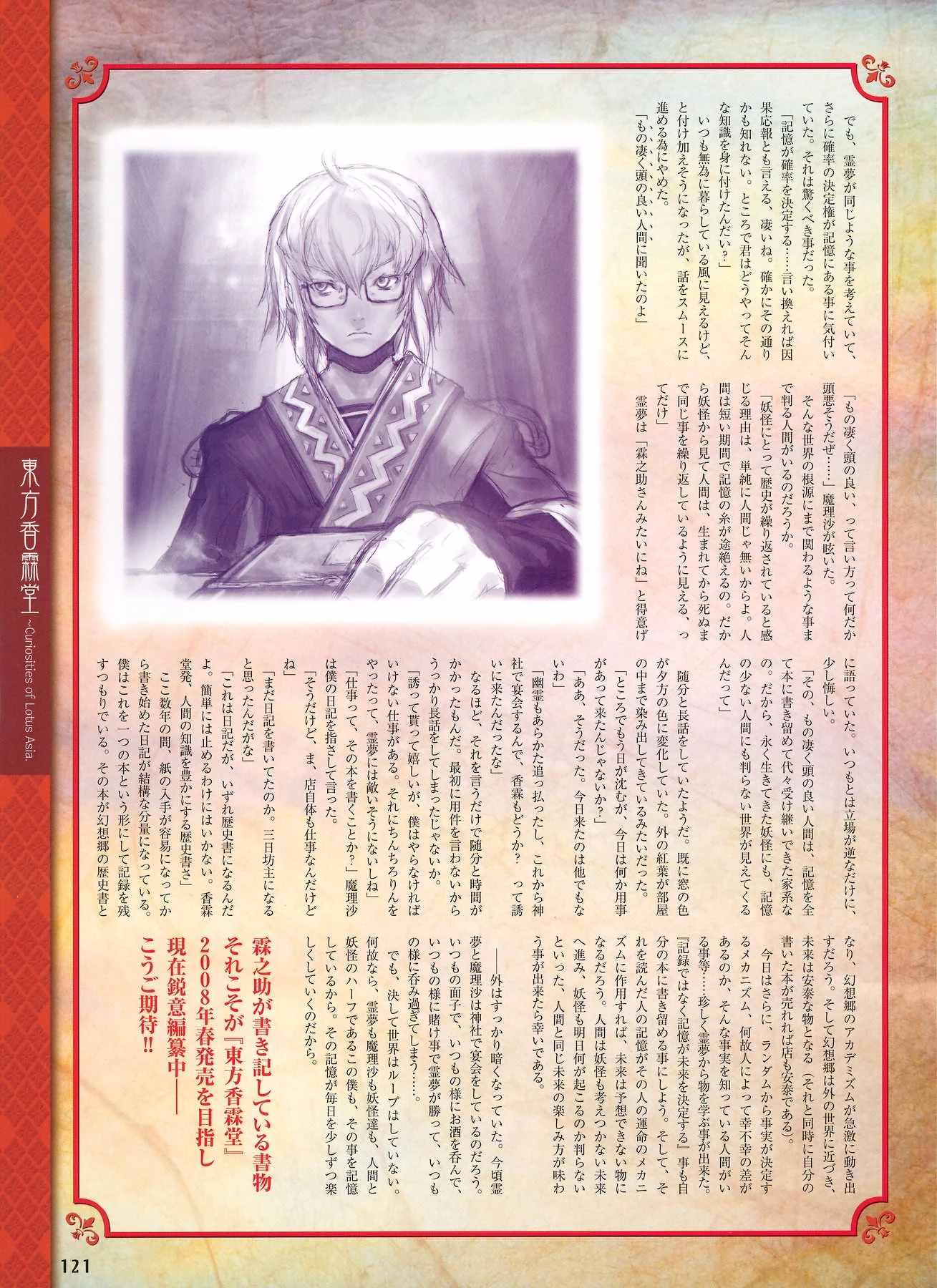 | 妖怪は、人間より圧倒的に寿命が長い為か、余り幻想郷の歴史を纏めようとしない。それは常に人間より優位に立てるという利点と、自分に都合が良いように歴史を変えたいと思っているのだろう。人間は歴史から様々な物を学ぶのだが、妖怪はその選択肢を意図的に奪っているのだ。