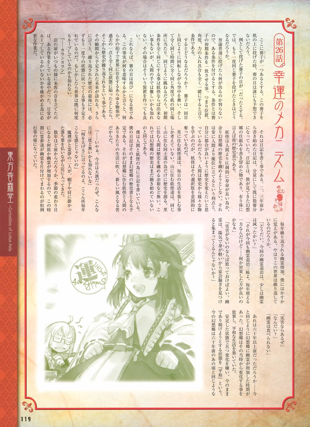 | 今日はさらに、ランダムから事実が決定するメカニズム、何故人によって幸不幸の差があるのか、そんな事実を知っている人間がいる事等……珍しく霊夢から物を学ぶ事が出来た。『記録ではなく記憶が未来を決定する』事も自分の本に書き留める事にしよう。そして、それを読んだ人の記憶がその人の運命のメカニズムに作用すれば、未来は予想できない物になるだろう。人間は妖怪も考えつかない未来へ進み、妖怪も明日何が起こるのか判らないといった、人間と同じ未来の楽しみ方が味わう事が出来たら幸いである。