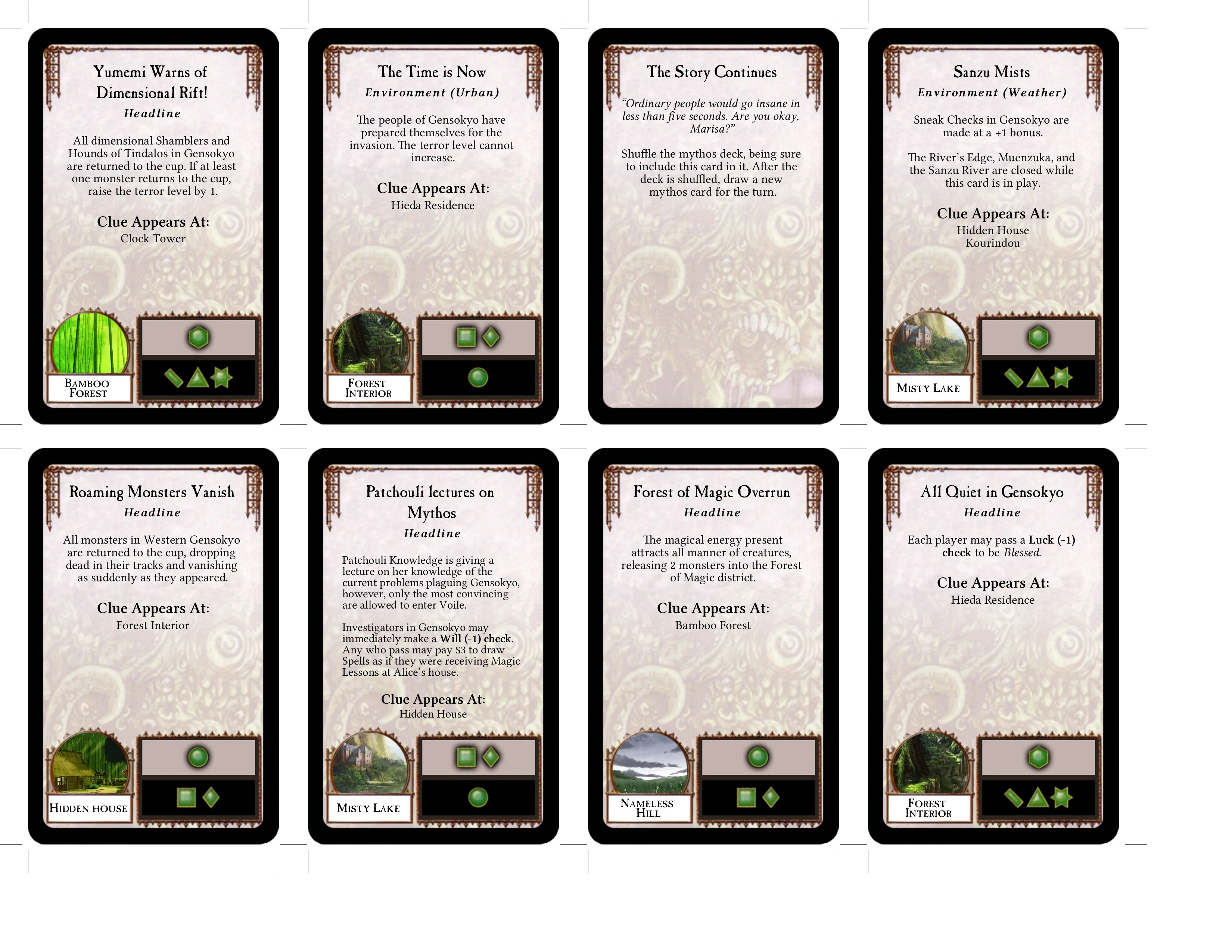 The Mythos Deck for Gensokyo Horror was made to be as balanced as possible in comparison with the regular Arkham Horror Deck. By this I mean that equivalent places for the most part have the same ratio of gate spawns and clue token appearances. For example, if the Hidden House = Unvisited Isle, than the Hidden House will have the same number of Gate Spawn and Gate Burst cards as the Unvisited Isle.