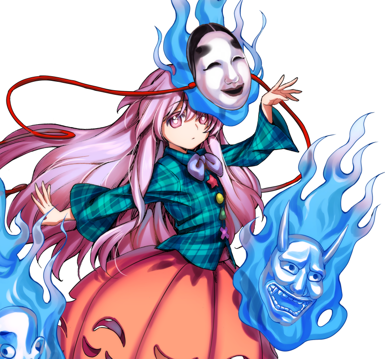Hata no Kokoro is a youkai of menreiki, and she holds a total of 66 masks. She became a youkai after a long time from these masks which were used by the the father of Sarugaku performance, Hata no Kawakatsu.