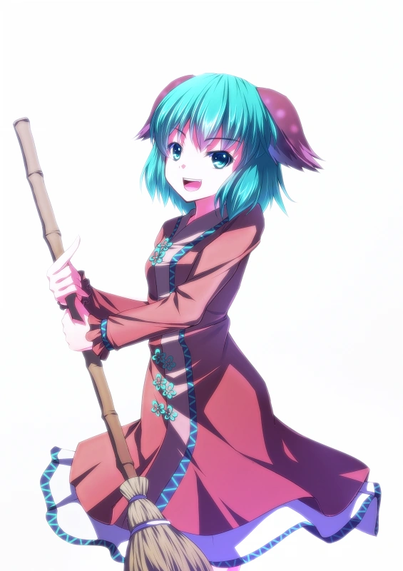 A broom carrying girl with a short blue hair. She wears a long red shirt which covers most of her skirt underneath.