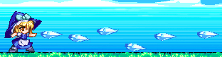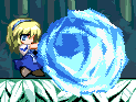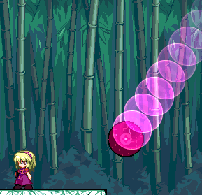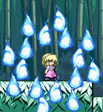 Starts a small ice ball in Alice's hand; the longer the fire button is held, the larger the ball gets. It has three levels of power; after a few seconds of holding a maximum-power shot, it will fire automatically (otherwise it can be fired at any time by letting go of the fire button). An amalgamation of Mega Man 2's Atomic Fire and Mega Man 4's Pharaoh Shot. If you get hit, you lose the charge, so be careful. You can also ram the charged snowball into enemies. A level one charge will be lost in this way, but past the smallest size, the ball will persist and deal continuous damage to enemies it is held within unless Alice is hit. This can be extremely useful against Eirin or some other bosses.