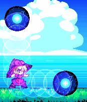 Shoots a large, glowing blue and white yin-yang that bounces slowly on the ground. Up to three orbs can be summoned at a time, although they dissipate instantly if they hit a wall. Although their effective range is quite short, the orbs have a very high attack power, will pierce most enemies and hit multiple times, and can destroy both the blue yin-yangs you encounter rolling around in some stages and the red orbs Reimu fires in a single hit. Highly useful against the final boss, and against Reimu herself during the teleporter boss rush.