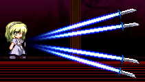 Fires out four knives at high speed in a spread pattern. Can take out most weaker enemies, but isn't much more powerful than a normal shot. It penetrates, and together with its spread can take out a mass of enemies in front of you very quickly, although it has a blind spot in the middle. Another nice feature is that it consumes very little energy, allowing you plenty of shots. Similar to Mega Man X4's Twin Slasher.
