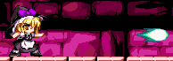 Fires a huge red orb of energy straight forwards, leaving behind a bat-shaped trail of magic that gradually dissipates. The trail can cause residual damage similar to Mega Man X4's Plasma Shot. This weapon has very high attack power, and is probably Marisa's best weapon, although it consumes the ammo gauge like mad if abused. Further adding to its versatility, it can be fired upwards diagonally (1) or straight up (2), and if it is fired diagonally, it can ricochet off walls (if fired straight it goes through them). For maximum damage effect, fire it in an open area and chase after it so the residue trail remains on screen as long as possible. Supremely useful against many bosses.