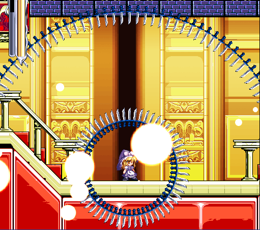 Freezes time on screen for about five seconds; in the process, generates two concentric rings of knives. Once the time freeze ends, the knives strike every enemy on screen. Causes heavy damage to any enemy that isn't immune to it; most weaker enemies will be destroyed immediately. Be aware that while time is frozen you can still get hit by any enemies or projectiles on screen. Crucial to survival, especially in the Quick Man-style force beam section of the Patchouli fortress's first level. Similar to Mega Man 6's Centaur Flash, in that it must be reactivated if you want to freeze time again. Goes through energy rapidly and can only be used up to four times without collecting more energy, so make it count.