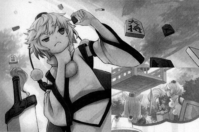 Momiji makes two appearances in Symposium of Post-mysticism that look similar to her appearance in Oriental Sacred Place, however, she doesn't appear to have wolf-like ears. In addition, Kanako's Newspaper article includes two White Wolf Tengu, one of which is Momiji. The unidentified White Wolf Tengu appears to have ears and longer hair whereas Momiji in both appearances in Symposium of Post-mysticism does not have ears. It is unknown as to whether or not this is an error or Momiji truly just does not have wolf ears, unlike her appearance in oriental Sacred Place.