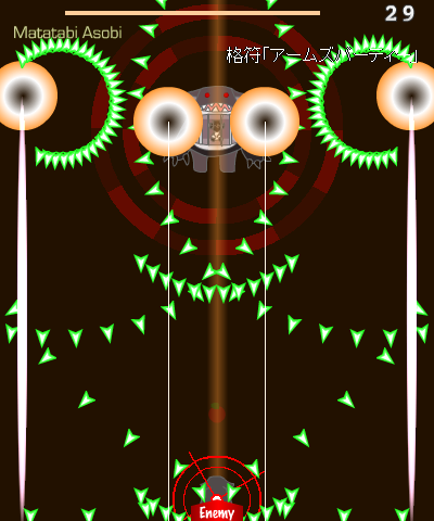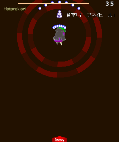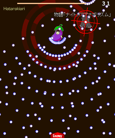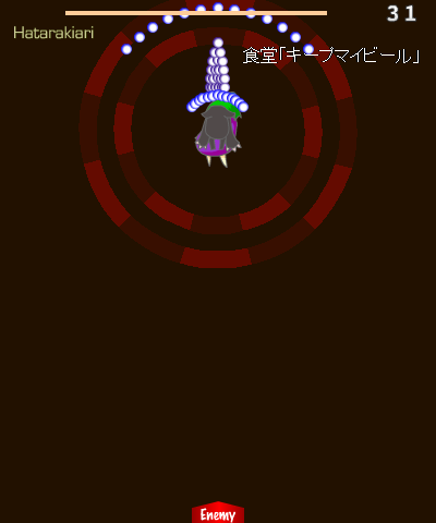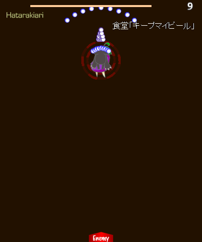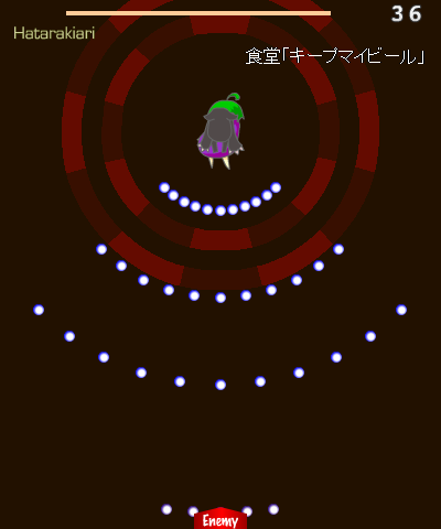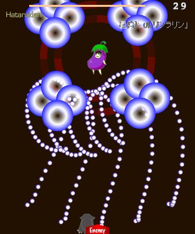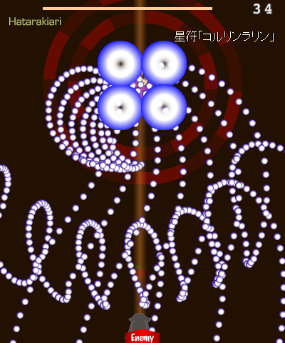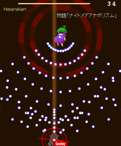 The homing lines spawn every 6 seconds starting 4 seconds into the spell card. The large waves spawn every 7 seconds starting 8 seconds into the spell card. Stay near the bottom of the screen, near the middle stream. When the homing lines or large danmaku waves approach, cross a gap in the stream. Stand on Hatarakiari's face for 7 seconds to graze many bullets.