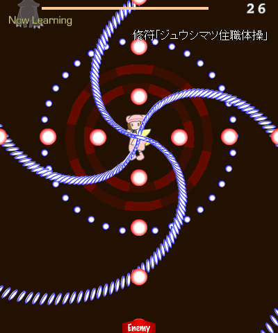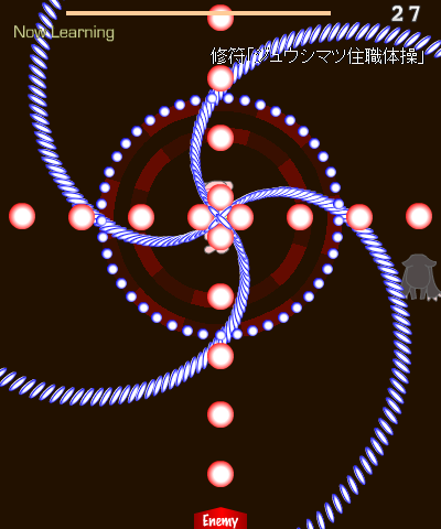 Three trajectories. A field of twenty small danmaku and one large danmaku. Two waves of ten small danmaku. Three streams of fourteen small danmaku. FOEs will sporadically spawn from the top of the screen.