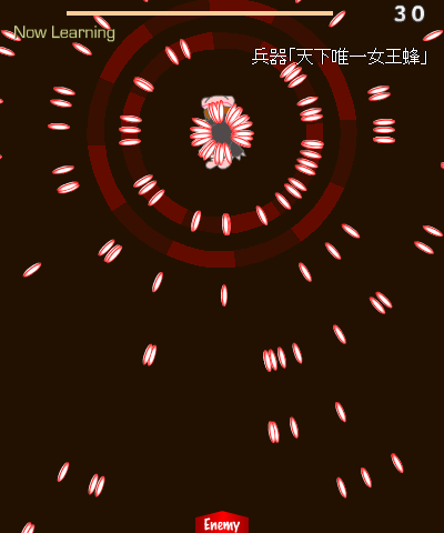 Four trajectories. A preliminary stream of 120 homing needle bullets. About three complete rings of needle bullets. A second stream of 120 homing needle bullets. Two large danmaku.