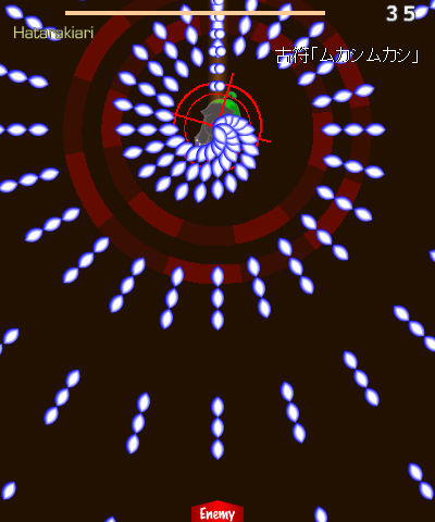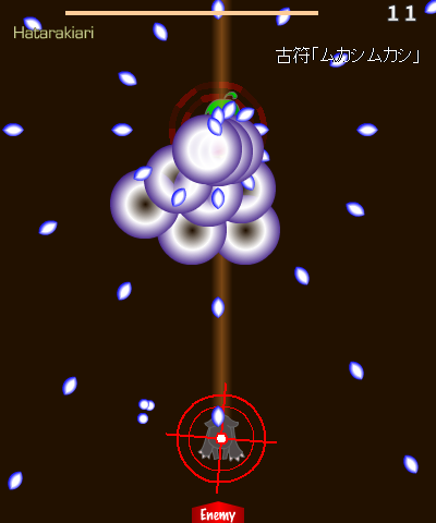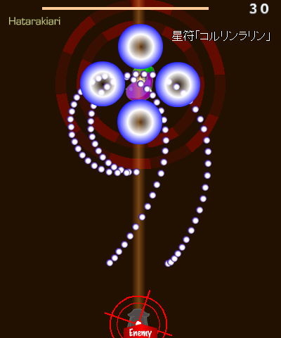Three trajectories. 24 cyclic streams of normal bullets. Two homing lines of eleven small danmaku. Six waves of three homing large danmaku.