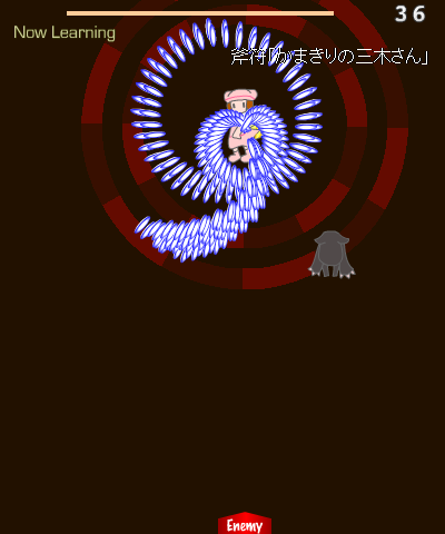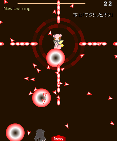 Three trajectories. 12 cyclic streams of normal bullets. Two homing lines of two small danmaku. Three waves of three homing large danmaku.