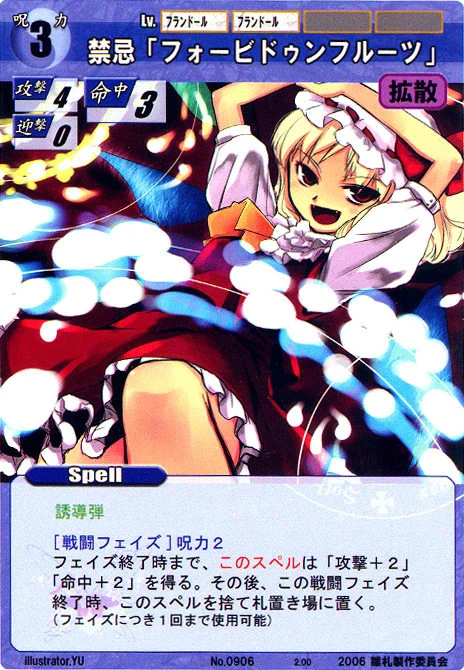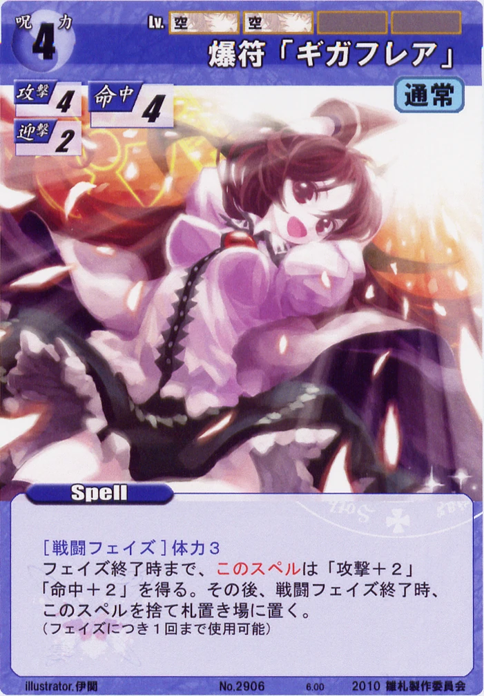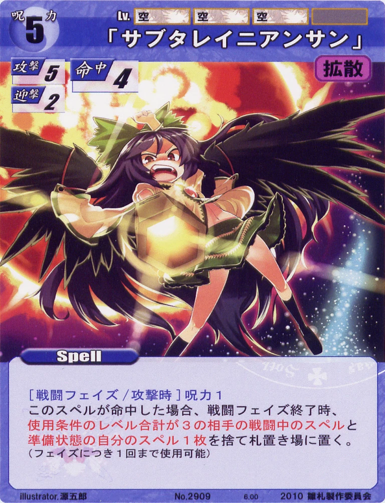 - Special 2: [Replenishing Phase/Attack] 1 SP If your Utsuho is level 4, discard a Support equipped to this Spell to inflict 1 damage to your opponent's leader (this Special can only be used once per phase).
