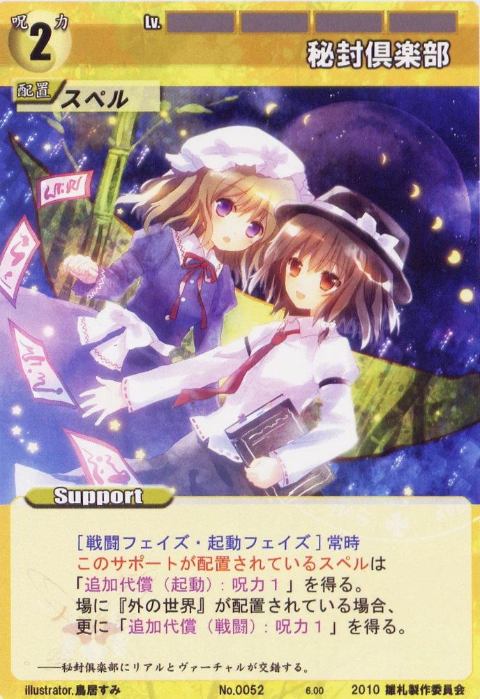 - Special: [Battle and Preparation Phase] The Spell this Support is equipped to gains the text "Extra Cost (Activate): 1 SP". If "The Outside World" is also in play, it also gains the text "Extra Cost (Battle): 1 SP".